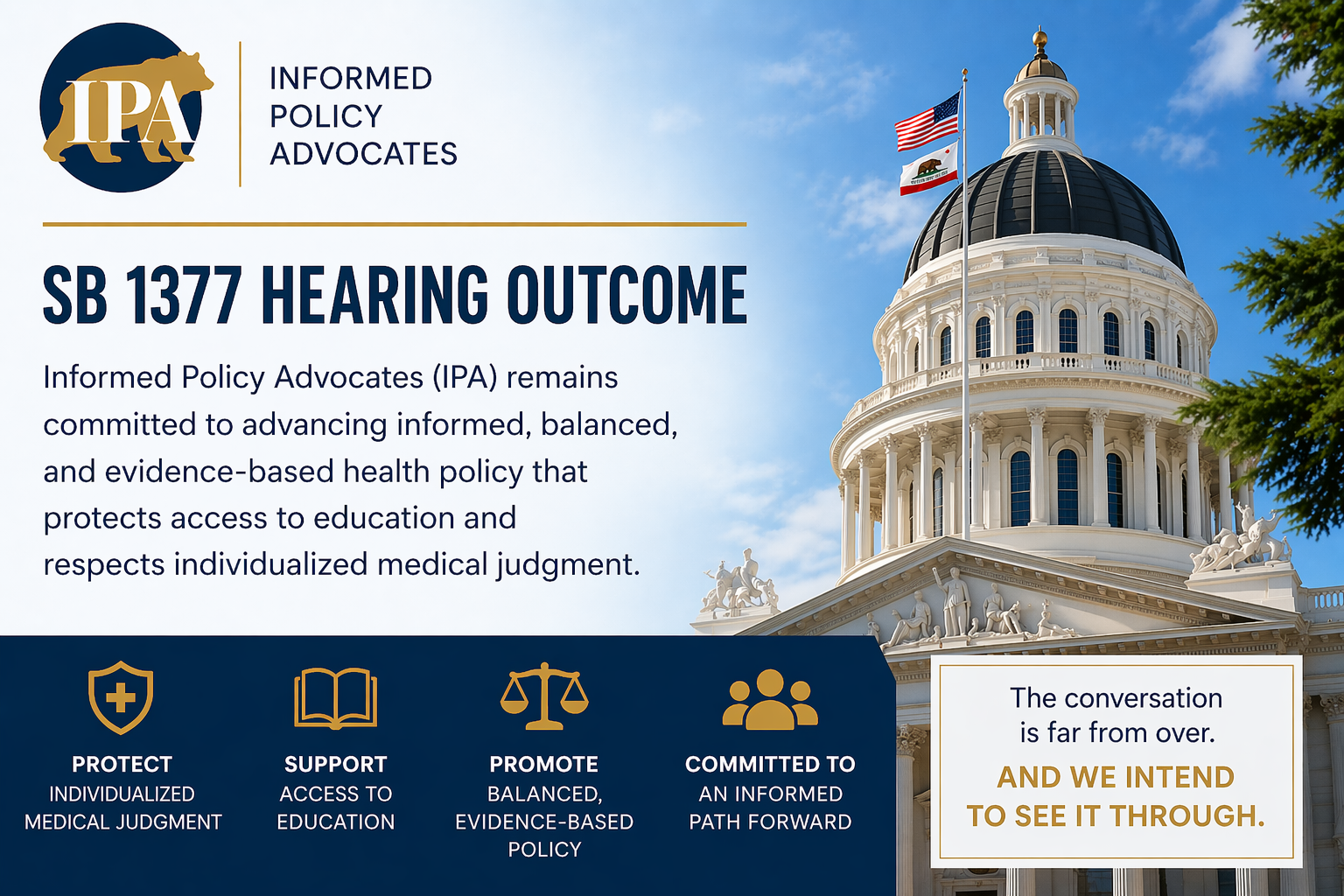 Equally important, this process provided a clearer understanding of the political landscape and the work required to move forward. Informed Policy Advocates will continue working with legislators on both sides of the aisle to advance policies that protect access to education, restore physician discretion in individualized care, and ensure public health policy remains balanced and evidence based.